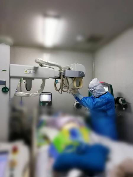 2月14日下午,醫(yī)囑需要為患者拍片。為減少放射科醫(yī)生接觸感染的機(jī)率和緊俏的防護(hù)服等物資消耗,陳贊醫(yī)生操作床旁的X光機(jī),給把原本應(yīng)該由放射科的拍胸部平片的活都干了。后又反復(fù)多次為患者進(jìn)行拍片檢查。為節(jié)約N95口罩,保證一線資源,陳贊沒(méi)有在隔離病房外帶過(guò)一個(gè)N95口罩。