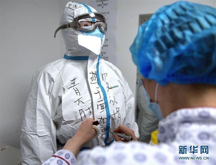2月20日,新華社報(bào)道,在華中科技大學(xué)附屬同濟(jì)醫(yī)院光谷院區(qū),一名醫(yī)護(hù)人員在即將進(jìn)入病區(qū)的羅從娟主任防護(hù)服上寫(xiě)下“熱干面加油”字樣(圖文來(lái)自新華社記者唐衛(wèi)彬等,李賀攝影)。