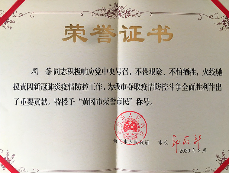周蕾被授予“黃岡市榮譽市民”稱號