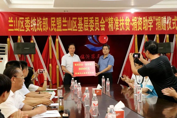 2020年9月16日下午,民盟臨沂蘭山區(qū)基層委員會在中共蘭山區(qū)委統(tǒng)戰(zhàn)部的帶領(lǐng)下到臨沂三中開展“精準扶貧捐資助學(xué)”活動。蘭山區(qū)人大常委會副主任徐金民、中共蘭山區(qū)委統(tǒng)戰(zhàn)部常務(wù)副部長岳洪波、民盟蘭山區(qū)基層委員會主委陳正義、臨沂三中校長律文忠等出席活動。