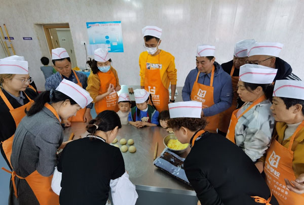 廣華職業(yè)培訓(xùn)學(xué)校校長(zhǎng)、牟平支部盟員王濤熱情接待了盟員們,并安排面點(diǎn)專業(yè)教師教授大家學(xué)習(xí)烘焙花式甜面包和戚風(fēng)蛋糕。老師細(xì)致講解,盟員和家屬們認(rèn)真學(xué)習(xí),分成兩組分工協(xié)作,親手體驗(yàn)各個(gè)制作步驟,稱重揉面、夾餡兒、發(fā)酵,再抹上蛋黃加以烘烤,面點(diǎn)的香甜味兒很快彌漫滿屋,現(xiàn)場(chǎng)一團(tuán)和氣,孩子們也自得其樂,氣氛十分熱鬧。午餐時(shí),大家品嘗著自己的勞動(dòng)果實(shí),每個(gè)人的幸福之情溢于言表,紛紛表示通過本次活動(dòng)深切感受到了盟組織給予溫暖大家庭氛圍,并希望支部經(jīng)常組織此類活動(dòng)。高斯明對(duì)本次活動(dòng)給予了充分肯定,并指出:“盟員之家活動(dòng)不僅能讓盟員們學(xué)到實(shí)用技能,更難得的是可以讓盟員們共同感受到支部大家庭溫馨融洽的和諧氛圍,增進(jìn)彼此之間的溝通交流與團(tuán)結(jié)協(xié)作!