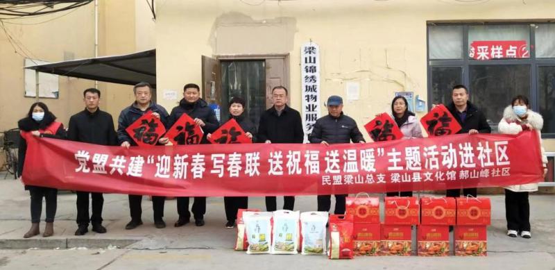 1月16日上午,民盟濟(jì)寧梁山縣總支聯(lián)合郝山峰社區(qū)、梁山縣文化館開展黨盟共建同心社區(qū)“迎新春 寫春聯(lián) 送祝福 送溫暖”進(jìn)社區(qū)主題活動(dòng)。中共梁山縣委統(tǒng)戰(zhàn)部副部長(zhǎng)張洪濤,民盟濟(jì)寧市委會(huì)副主委、梁山總支主委師青霞,梁山總支副主委李維博、梁山總支部分盟員、同心文化志愿者和社區(qū)同心志愿者參加了活動(dòng)。