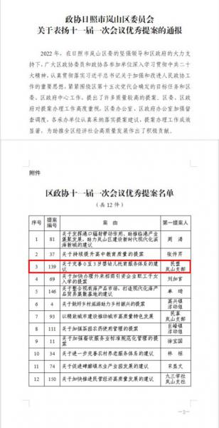 近日,日照市嵐山區(qū)政協(xié)通報表揚(yáng)了區(qū)政協(xié)十一屆一次會議優(yōu)秀提案名單,民盟日照嵐山區(qū)支部提案《關(guān)于完善0至3歲嬰幼兒托育服務(wù)體系的建議》獲評,民盟嵐山區(qū)支部已連續(xù)十年獲得區(qū)政協(xié)優(yōu)秀議案表彰。