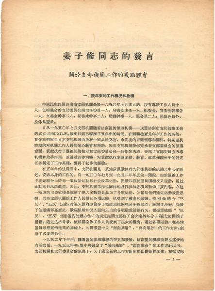 在中鐵隆檔案館里,珍藏著一份濟(jì)南民盟先賢姜子修同志在1956年作的《關(guān)于支部機(jī)關(guān)工作的幾點(diǎn)體會(huì)》發(fā)言資料,姜子修同志時(shí)任民盟濟(jì)南市第一屆委員會(huì)副主任委員。