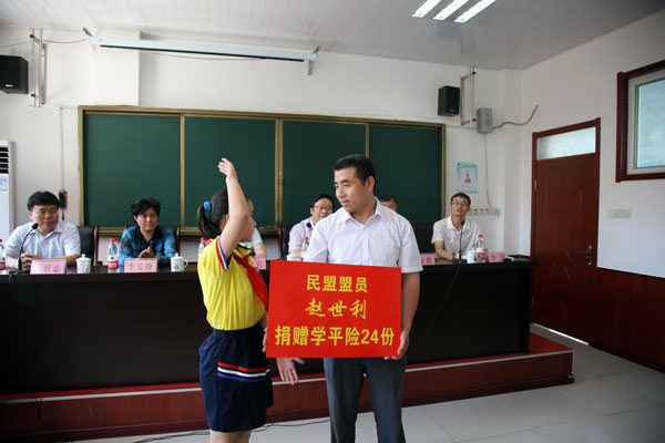 民盟盟員、中保人壽保險(xiǎn)公司寧津支公司經(jīng)理趙世利向受助學(xué)生捐助了學(xué)平險(xiǎn)。