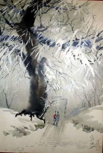 在文化大革命的暴風(fēng)驟雨中,先生飽受迫害,平生精品二百余幅為紅衛(wèi)兵所劫。文革時(shí)一位先生曾經(jīng)資助過的友人率先發(fā)難,貼先生的大字報(bào)。子女忿忿之時(shí),先生卻對他們說:“他也有他的苦衷啊!焙髞頍o論是下放勞動(dòng)還是被“批斗”,先生也只是淡然一笑,不曾怨恨。1975年先生恢復(fù)工作,重執(zhí)教鞭直至離世。先生晚年身心俱疲,復(fù)又為眼疾所擾,然仍堅(jiān)持教學(xué)和創(chuàng)作!睹妨执簳浴、《青島之夏》、《秋雨》、《雪中》、《寂靜》便是這一階段的代表作。