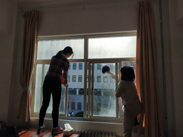 說(shuō)干就干,脫掉外套,擼起袖子,手拿抹布,登高擦窗。陽(yáng)光照在臉上、身上,暖烘烘的,寒意頓消。站在三樓的窗臺(tái)上,大家不顧登高的危險(xiǎn),不怕臟不怕累,有說(shuō)有笑,熱火朝天地干了起來(lái)。說(shuō)實(shí)在的,自家的玻璃都有幾年沒(méi)擦了,實(shí)在要擦,也都是找家政,很多人親手擦玻璃的經(jīng)歷估計(jì)都要追溯到學(xué)生時(shí)代了,像許老師這樣的90后,估計(jì)很少干過(guò)這樣的事情,此時(shí)卻正擦得一絲不茍。不經(jīng)意的一回頭,發(fā)現(xiàn)徐老師為了擦到玻璃的最上邊,一只攀著窗欞,身子幾乎要全部探出窗戶外邊去了,踮著的腳尖好像在隱隱的顫抖,汗水已經(jīng)順著額角淌了下來(lái)……