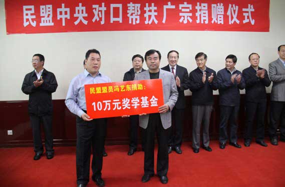 馮藝東(前排左)向民盟中央定點(diǎn)幫扶的國家級貧困縣河北省廣宗縣捐款設(shè)立獎學(xué)基金