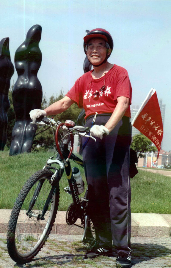 但有這樣一位八十七歲的老人,他組織了一支騎游隊(duì),每周都和他的變速自行車行在路上;他組織了一個(gè)單身老人俱樂部,讓許多老人走出孤單;他曾經(jīng)被提名“感動(dòng)青島”十佳人物;最近,他所寫的一首滿懷熱情的《青島你好》歌詞,被市委書記李群同志予以批示肯定,并通過文明辦、文化局予以推廣。