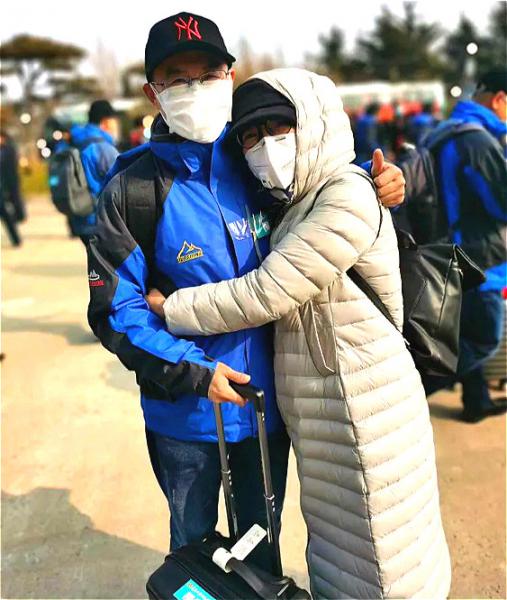 妻子則有些擔(dān)憂。身為同行,她更了解麻醉科面臨的風(fēng)險(xiǎn)。送行路上,兩人沒(méi)多少時(shí)間獨(dú)處,她忍住不舍,給了他一個(gè)很緊的擁抱。媒體鏡頭下,兩人笑著,他一手拉旅行箱,一手在愛(ài)人肩頭豎起拇指——這照片傳到基層微信群,青大教授蘇兆偉給他畫(huà)了幅速寫(xiě),在盟員們的朋友圈傳開(kāi),他小“紅”了一把。隔著玻璃跟愛(ài)人說(shuō)再見(jiàn)時(shí),他想到一大一小兩個(gè)兒子,不由得提前跟對(duì)方道了聲辛苦。路上他才知道,通知發(fā)出一個(gè)小時(shí)內(nèi),麻醉科有30多人報(bào)名,其中也有他愛(ài)人!暗?yàn)檫x了我去,就讓她留在了青島!