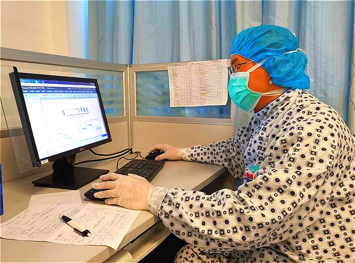 柳國(guó)強(qiáng)醫(yī)生在清潔區(qū)寫(xiě)病歷處理醫(yī)囑