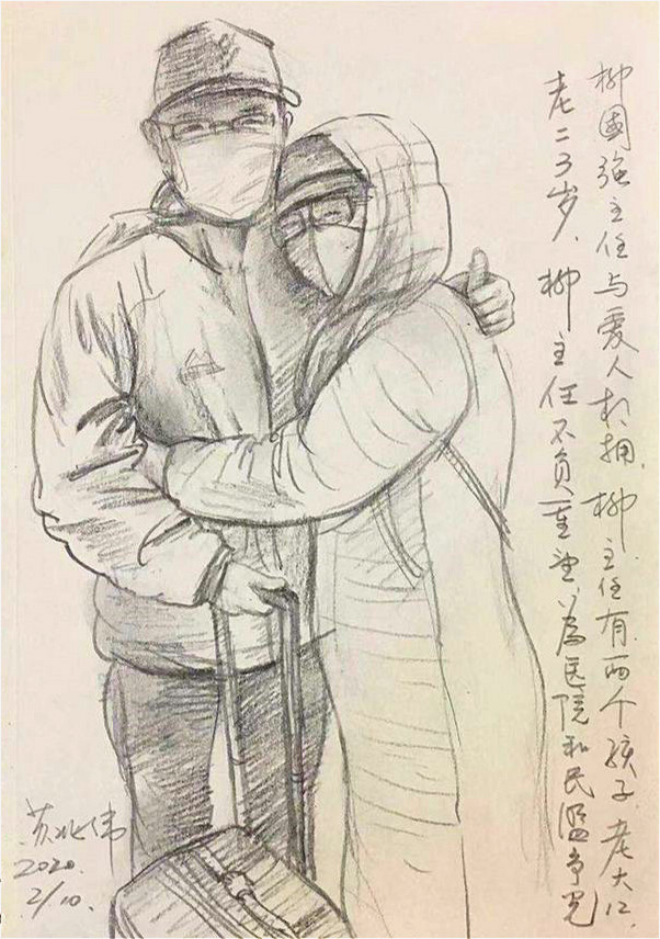 民盟青島大學(xué)基層委員會(huì)盟員蘇兆偉,感動(dòng)于柳國(guó)強(qiáng)醫(yī)生的行動(dòng),為他疾筆作畫(huà),一氣呵成