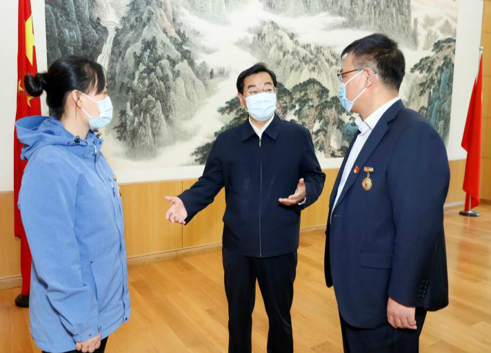 中共山東省委副書記楊東奇(中)同省醫(yī)務(wù)工作先模代表周蕾(左)、紀(jì)洪生交談